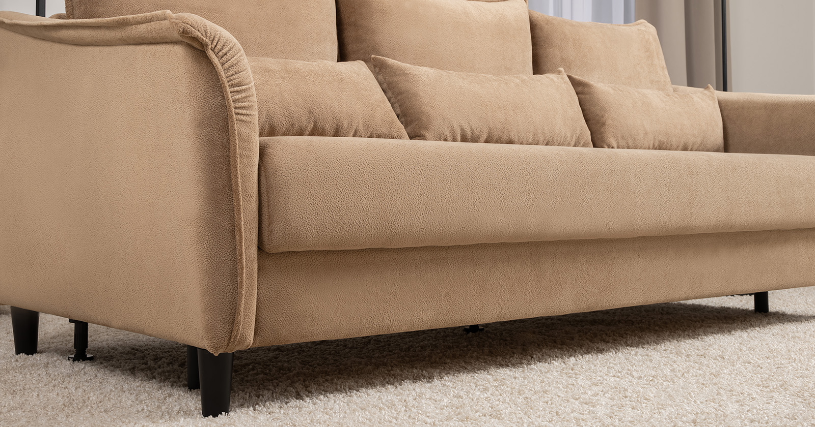 Изогнутые подлокотники в форме лепестков придают коллекции изысканный и элегантный вид, а дополнительные декоративные подушки обеспечат поддержку поясницы и помогут уютно устроиться на диване. В наполнении дивана используется высокоэластичная пена, которая адаптируется к форме вашего тела и гарантирует максимальный комфорт во время отдыха.