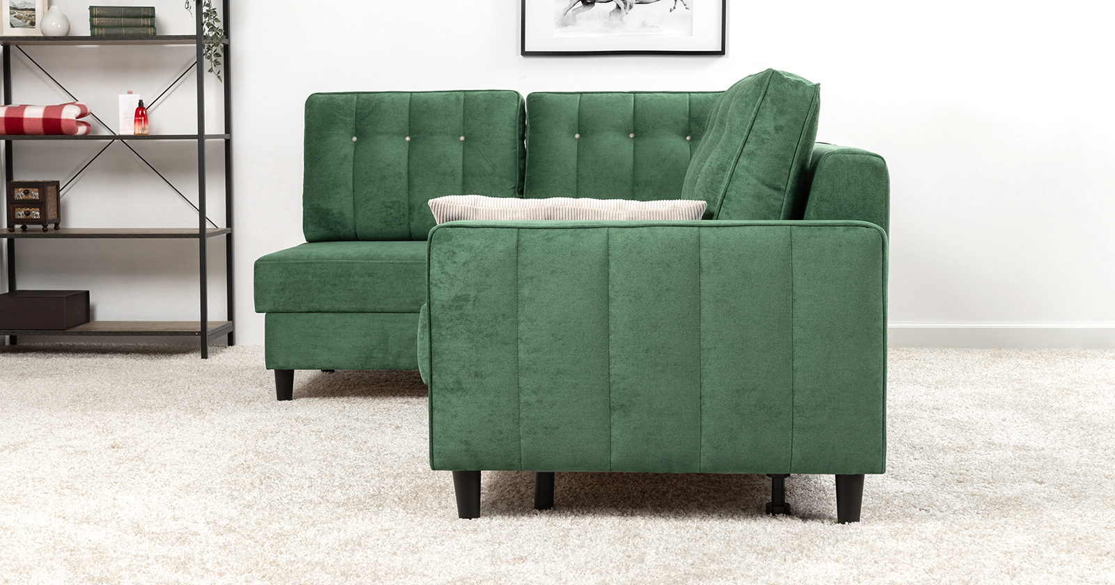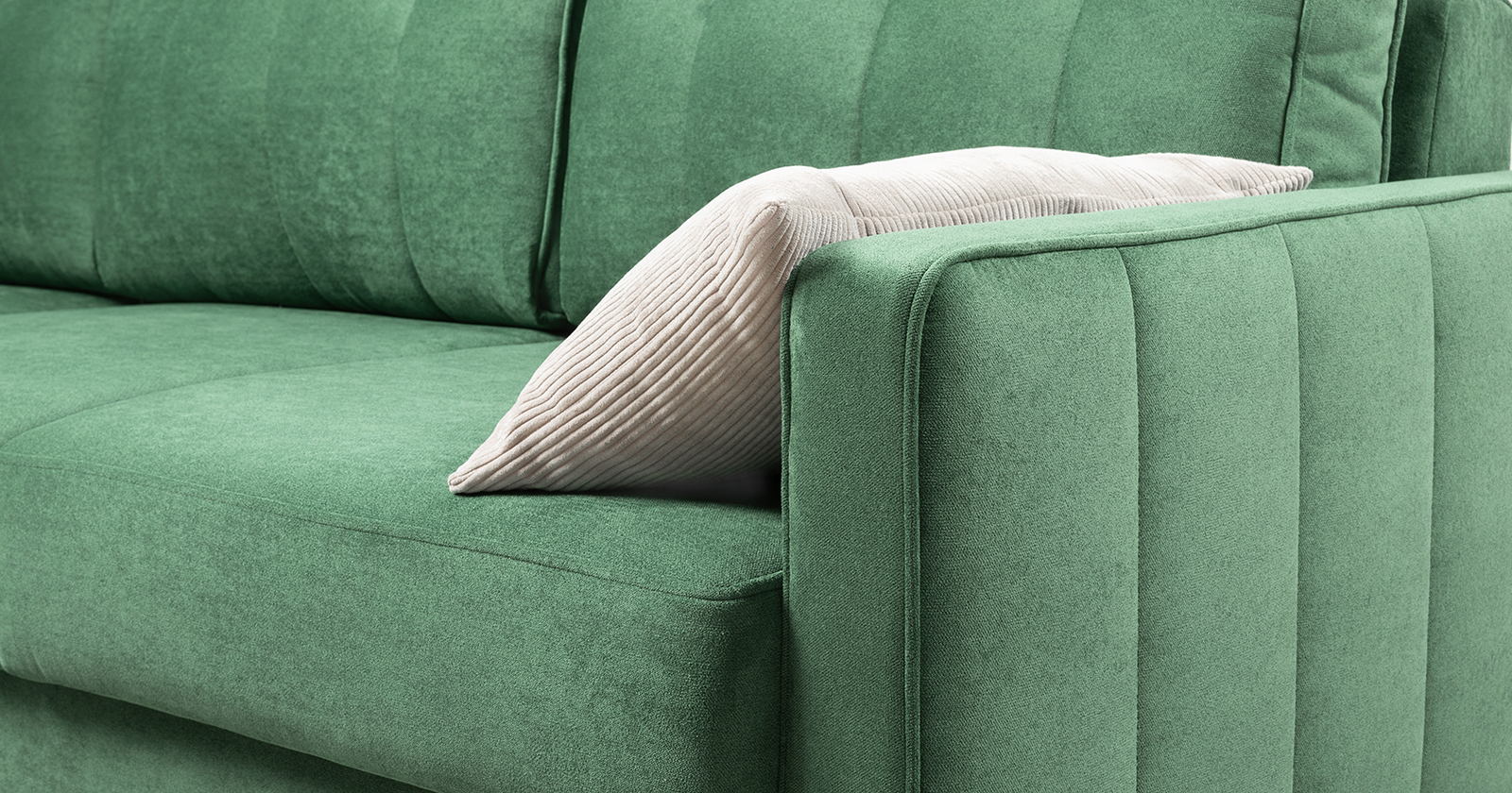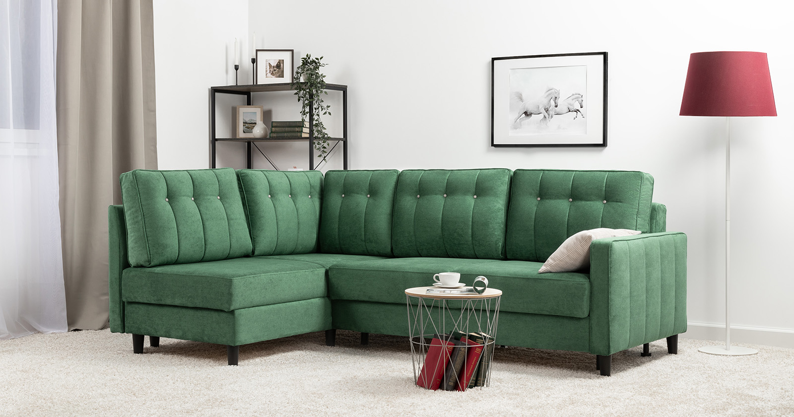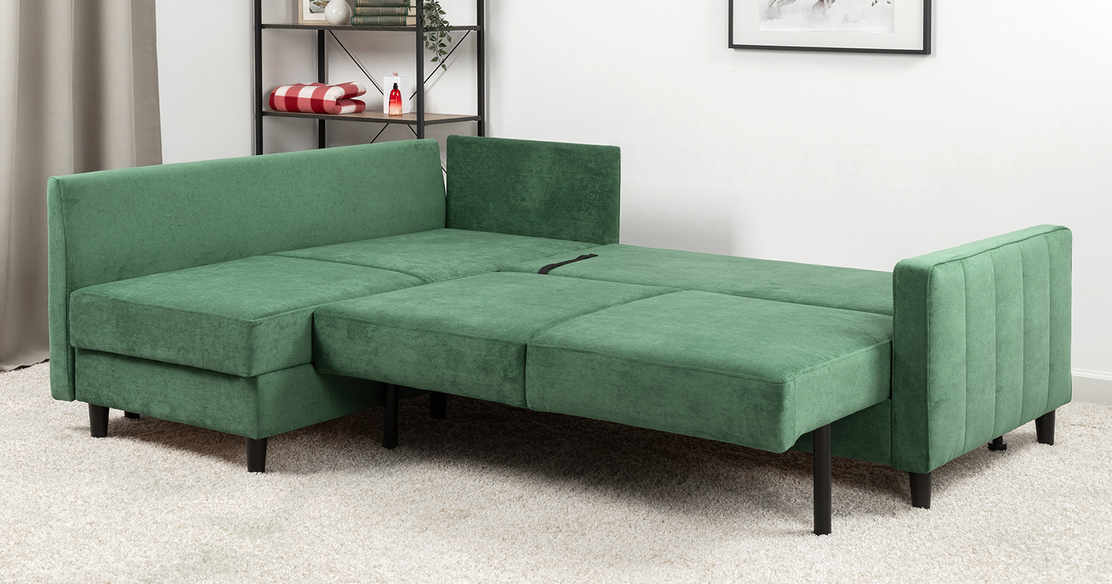 Диван-кровать угловой Арно ТД 566 велюр Лаки 20 хвойный зеленый, Vertical 910 молочно-серый, сборка на любую сторону