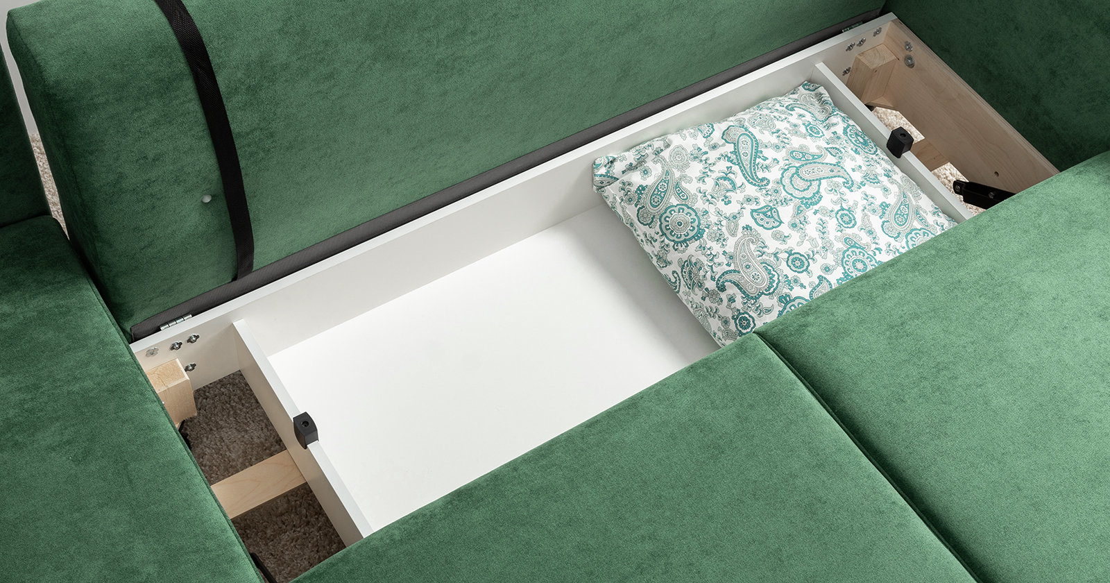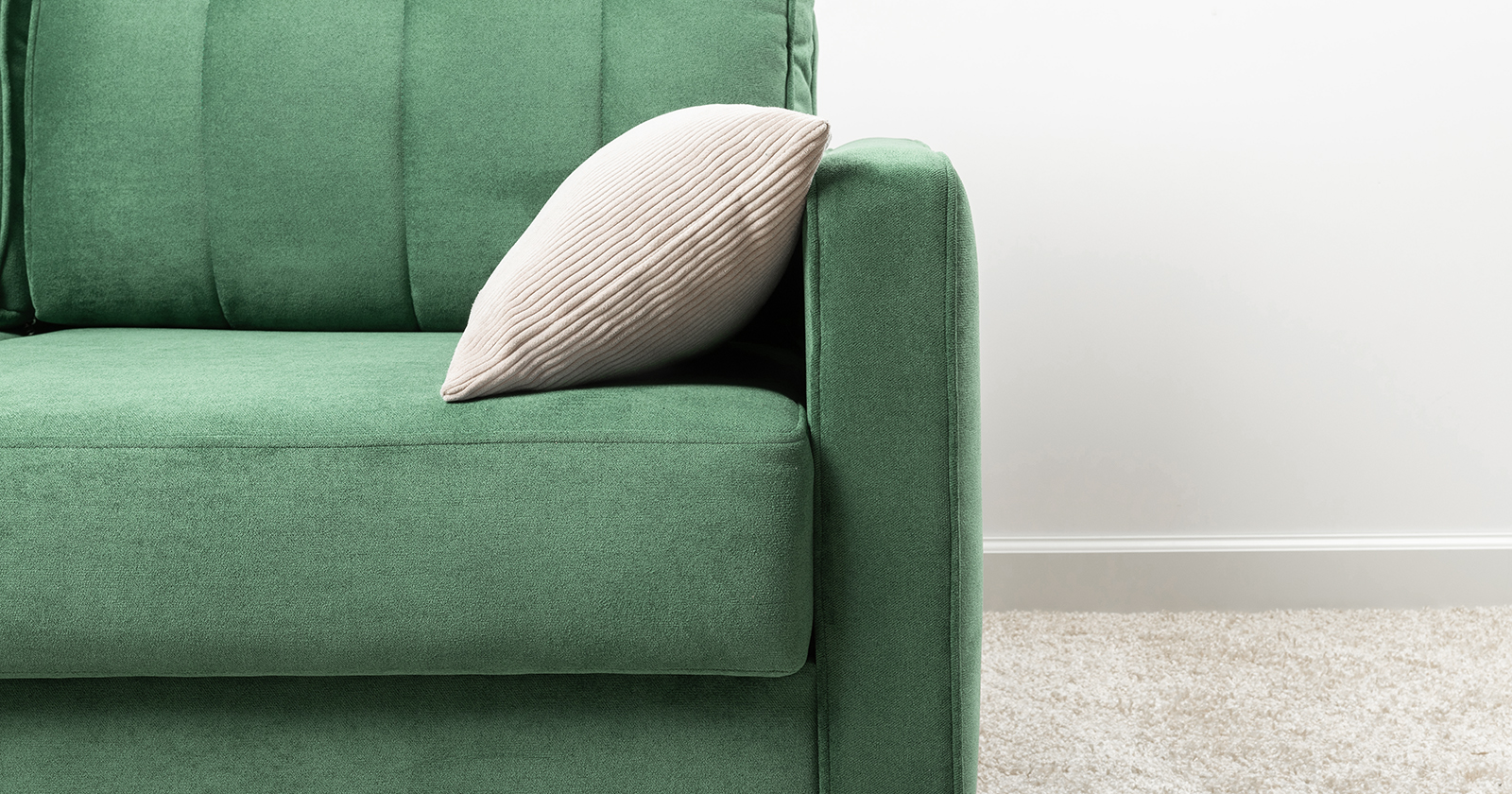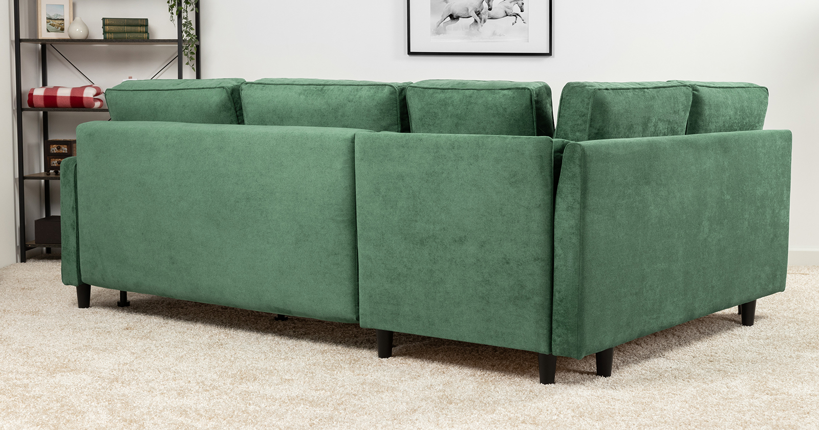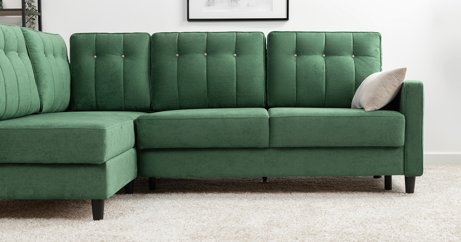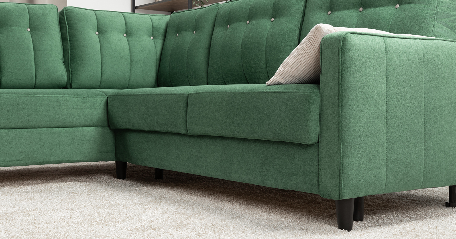 Диван-кровать угловой Арно ТД 566 велюр Лаки 20 хвойный зеленый, Vertical 910 молочно-серый, сборка на любую сторону