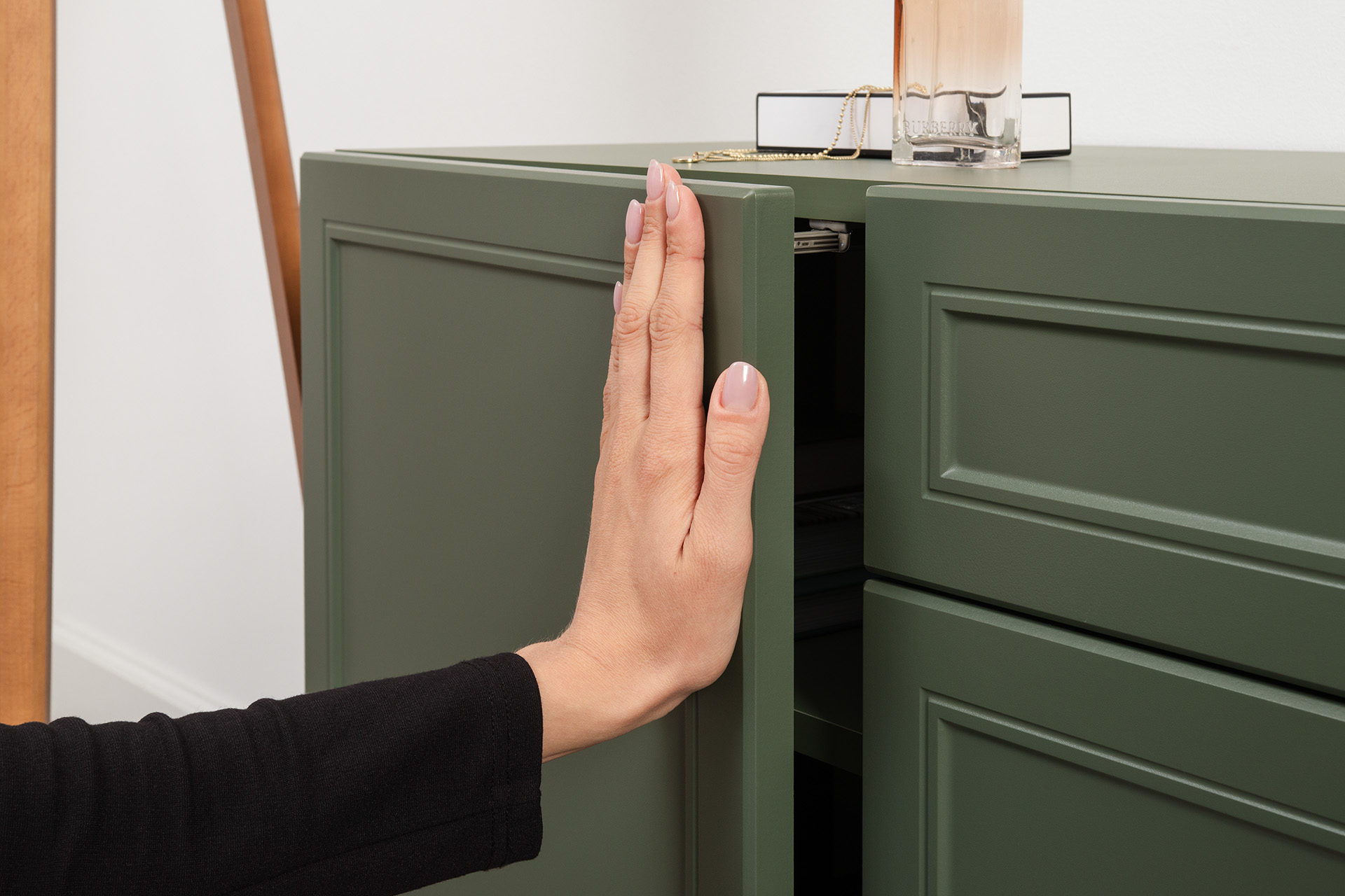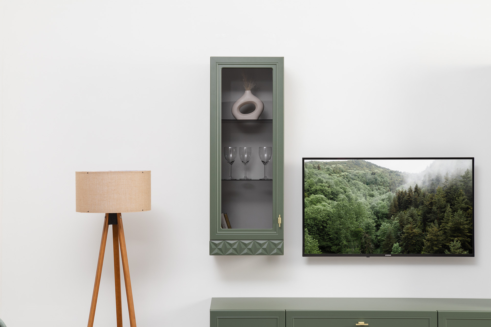 Изящные линии, глубокая фрезеровка фасадов из МДФ и благородные оттенки. Утончённая «Слоновая кость» и изысканная «Олива Шагрень» с глубоким зелёным тоном — создают атмосферу уюта, тепла и благородства. Металлические ручки и опоры золотого цвета придают мебели утончённый блеск, а петли и направляющие с доводчиками обеспечивают плавное и бесшумное закрытие фасадов.