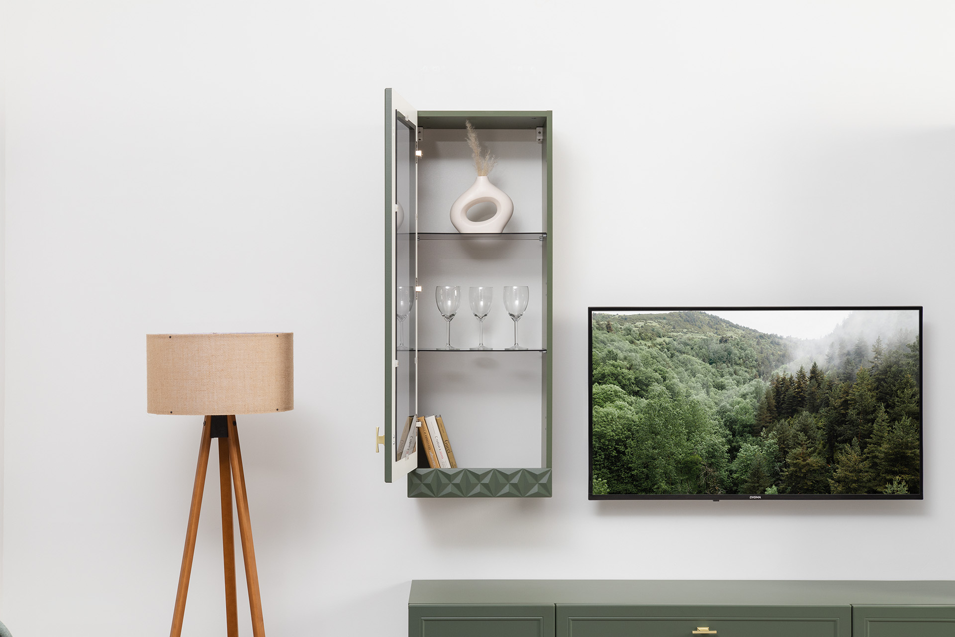 Гостиная Марион композиция 2 дымчатый зеленый K521, олива шагрень AG 1050 ПВХ, белый PE шагрень (собирается на любую сторону)