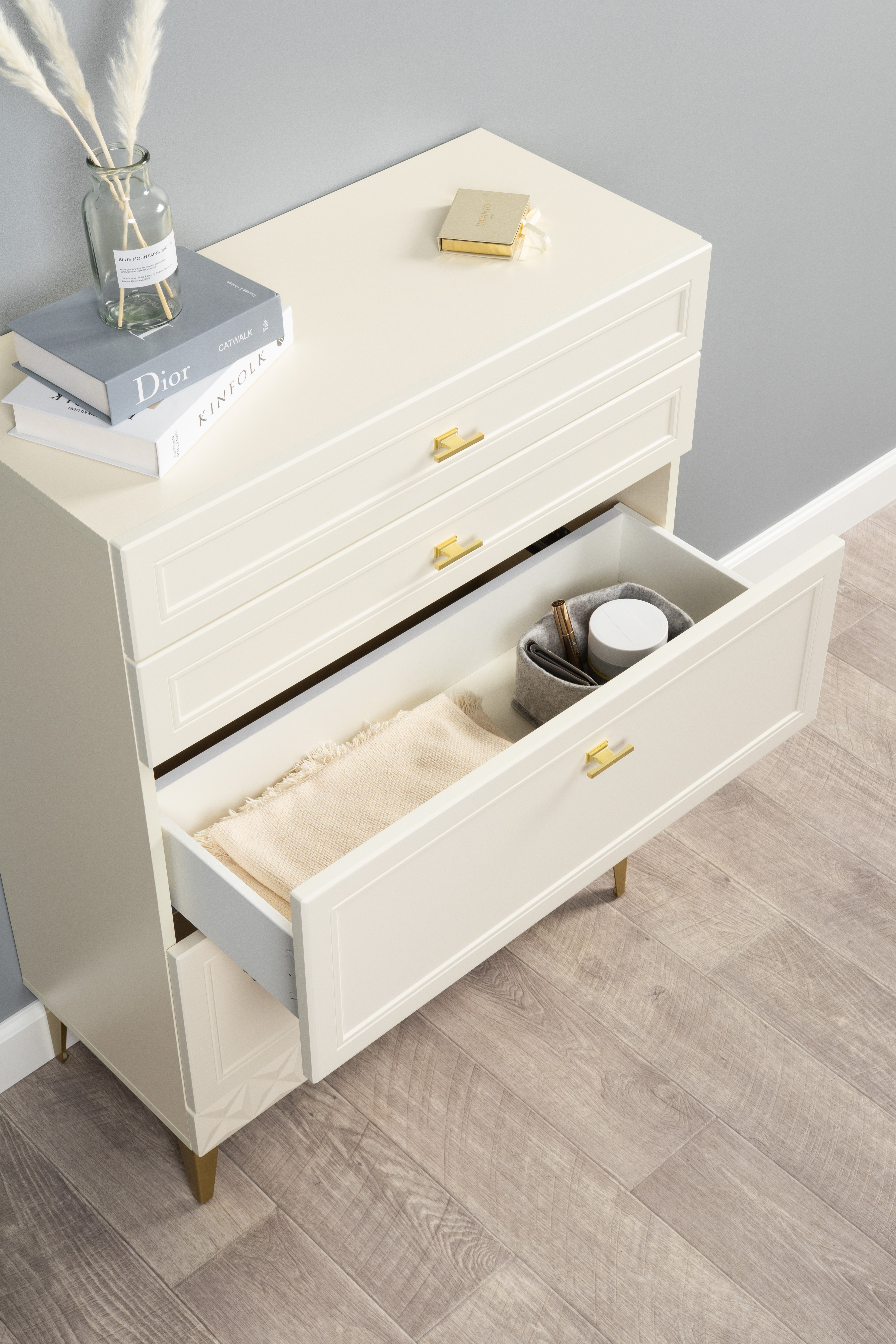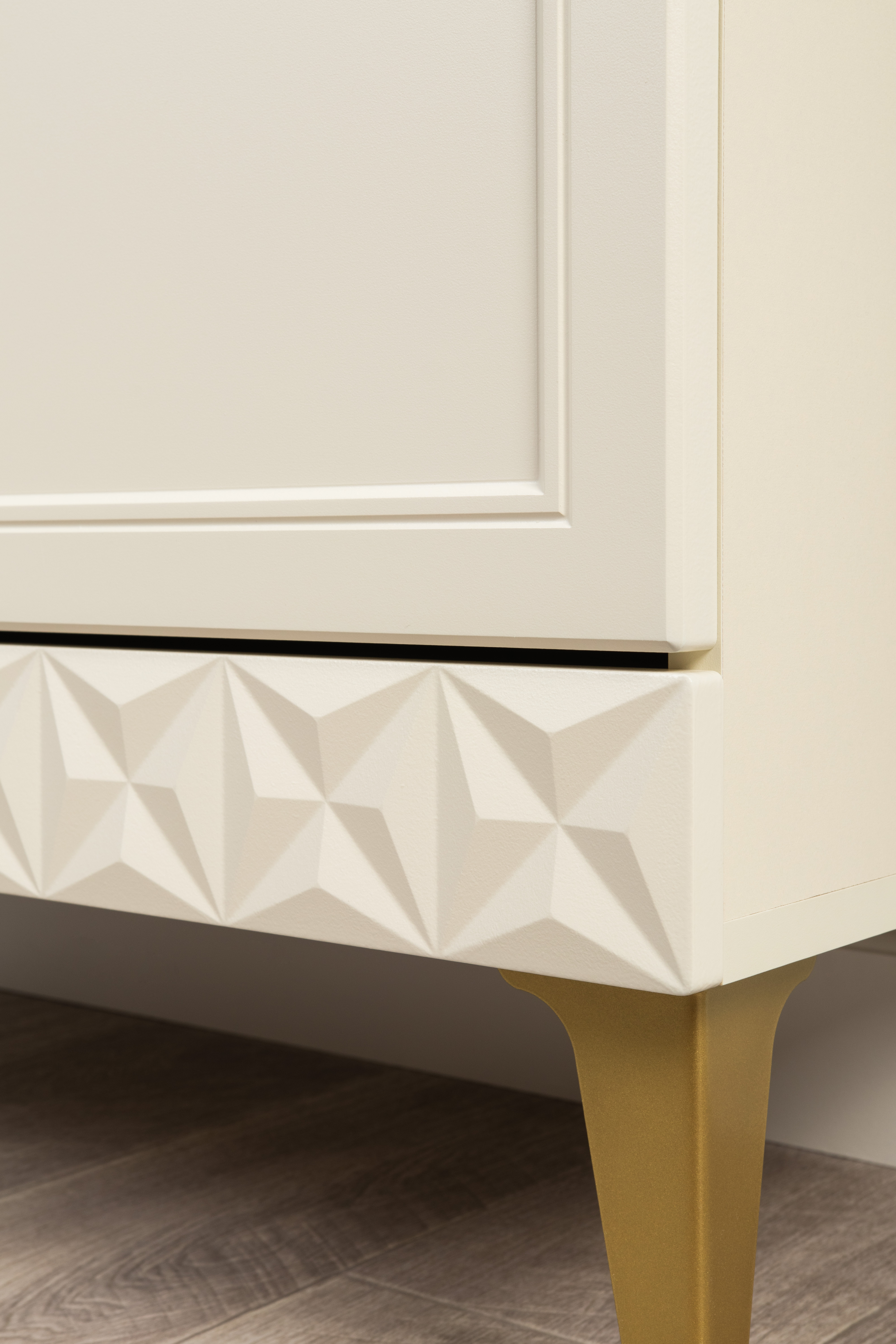 Изящные линии, глубокая фрезеровка фасадов из МДФ и благородные оттенки. Утончённая «Слоновая кость» и изысканная «Олива Шагрень» с глубоким зелёным тоном — создают атмосферу уюта, тепла и благородства. Металлические ручки и опоры золотого цвета придают мебели утончённый блеск, а петли и направляющие с доводчиками обеспечивают плавное и бесшумное закрытие фасадов.