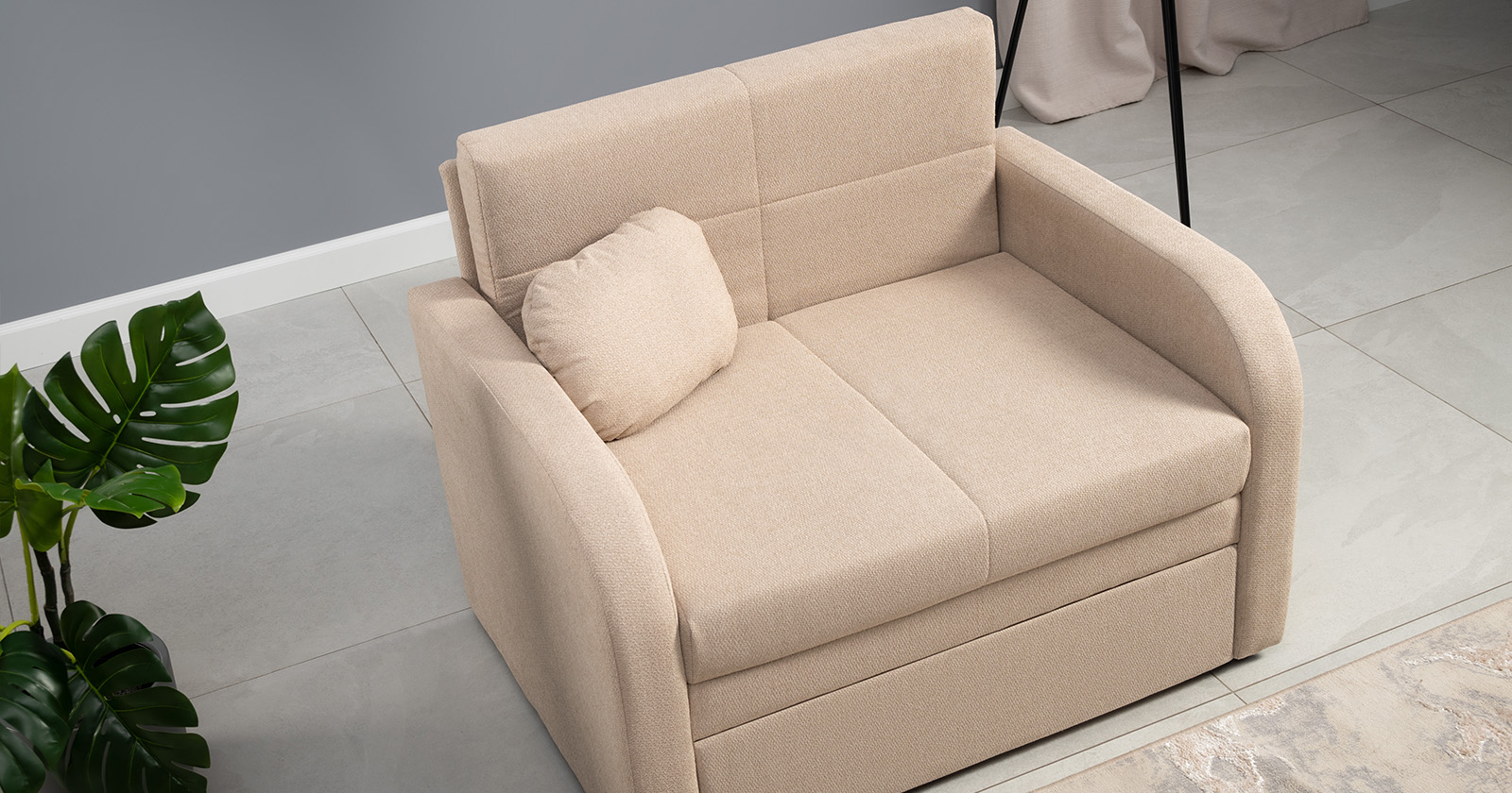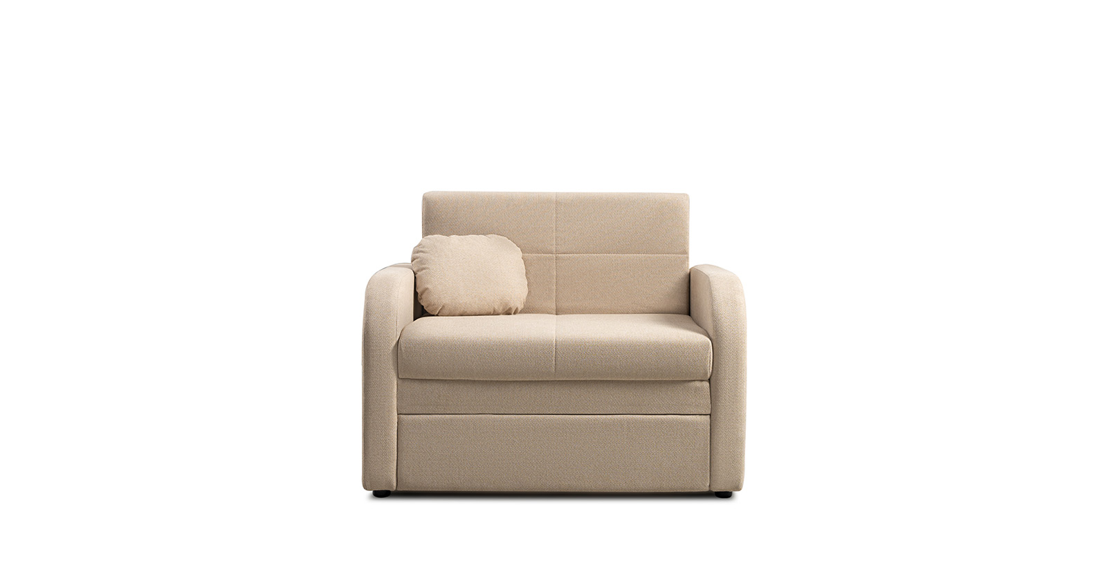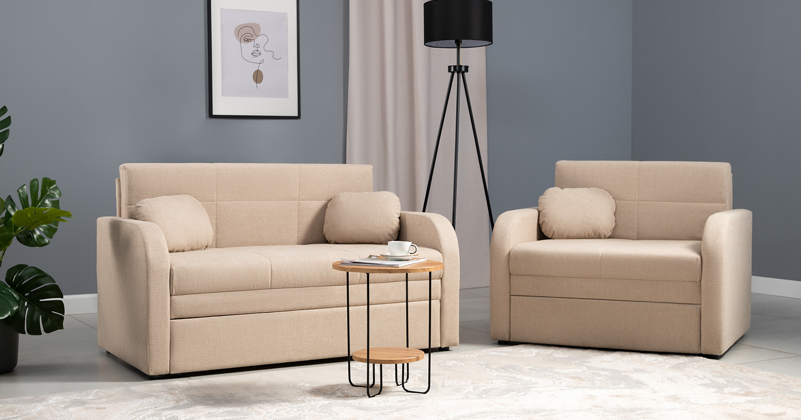 Коллекция выполнена в современном минималистичном стиле с мягкой обивкой из износостойкой ткани и декоративной стежкой, подчеркивающей геометрию форм. Механизм трансформации обеспечивает дополнительное спальное место, делая мебель не только эстетичной, но и максимально функциональной для небольших пространств.