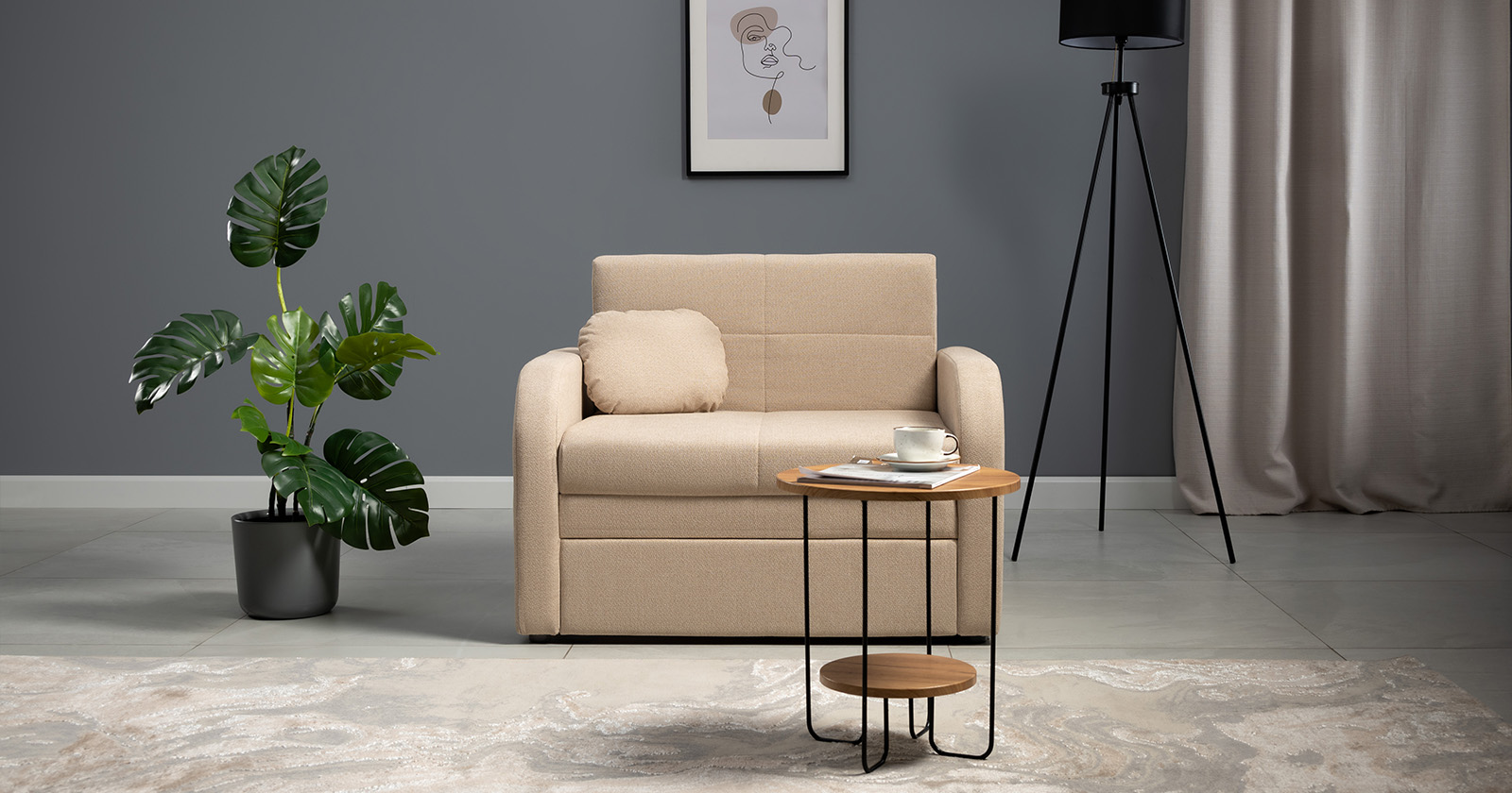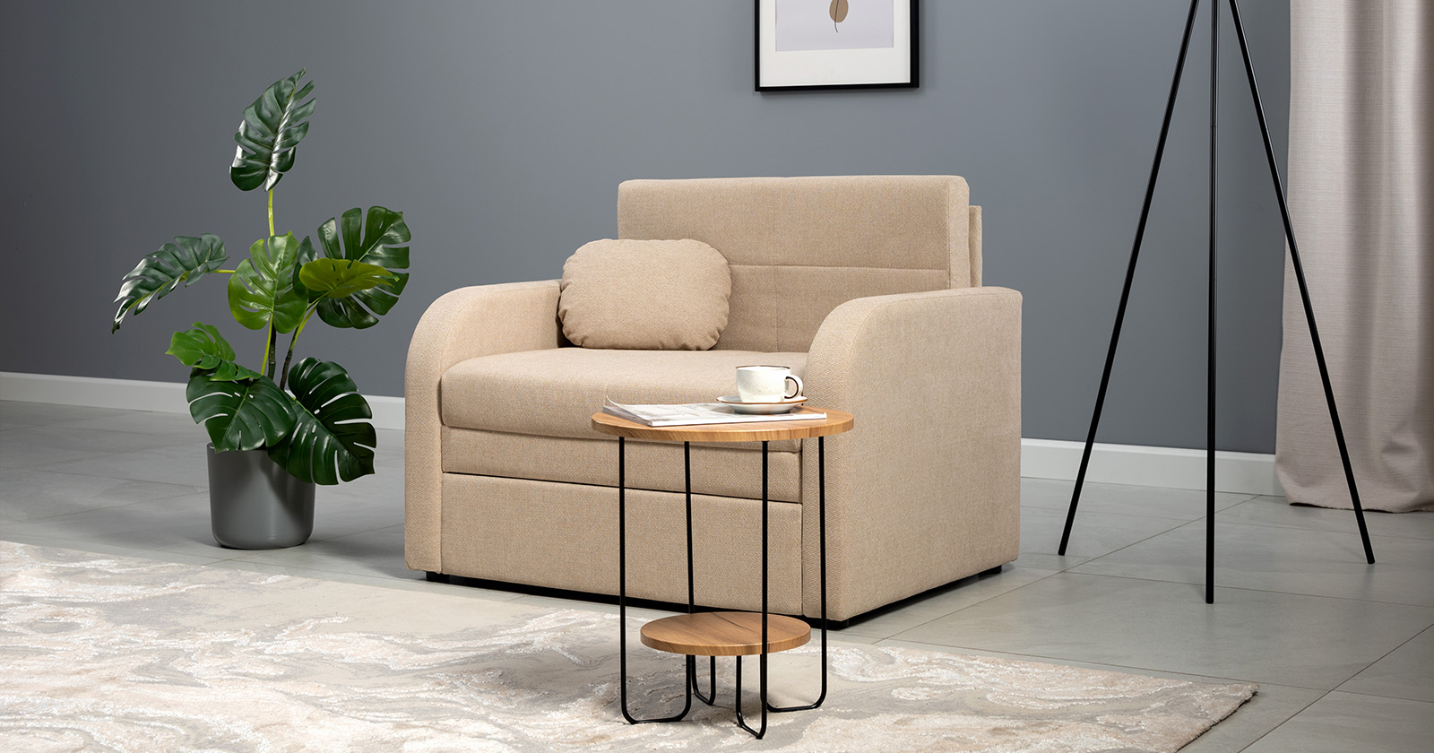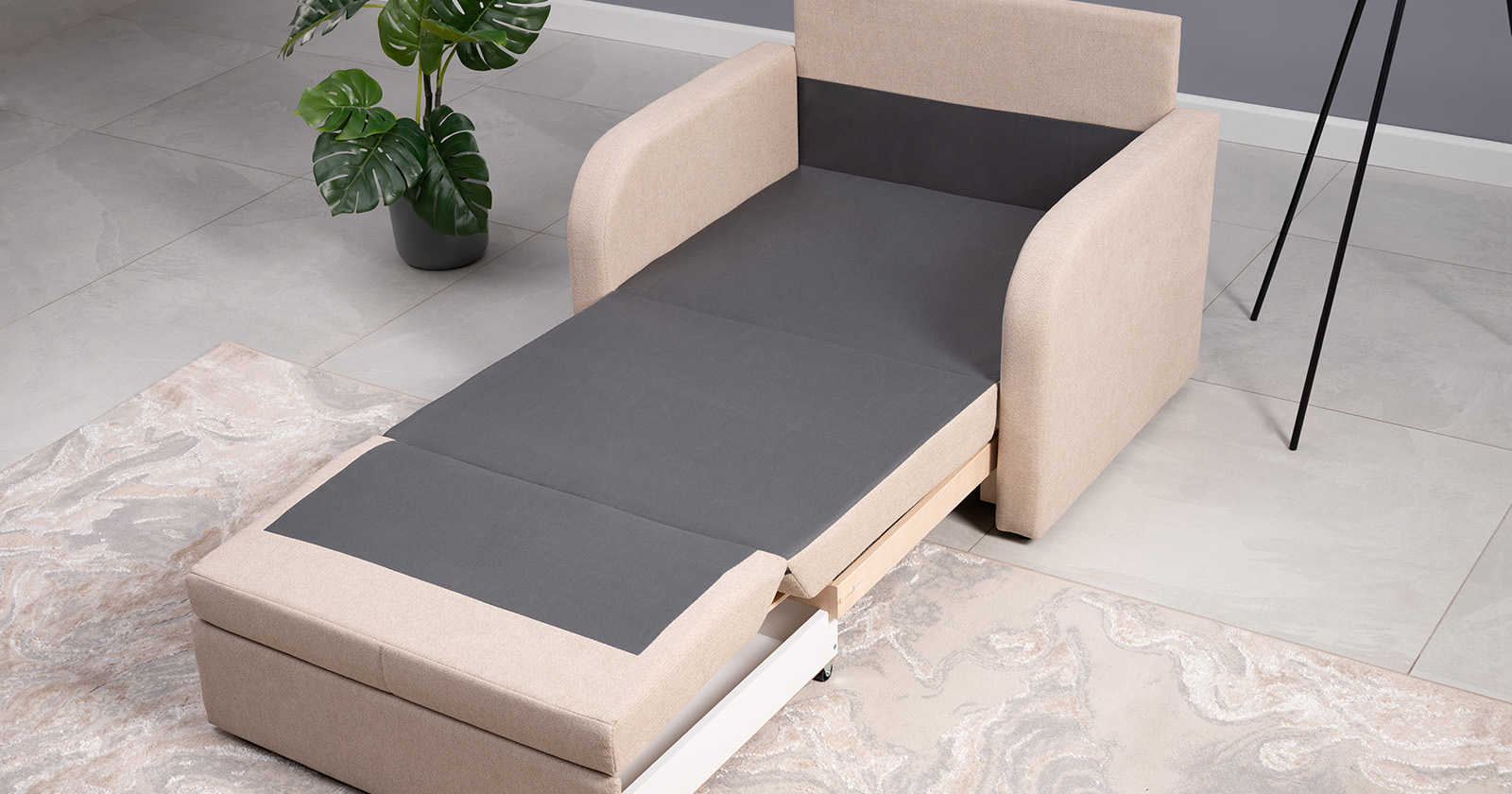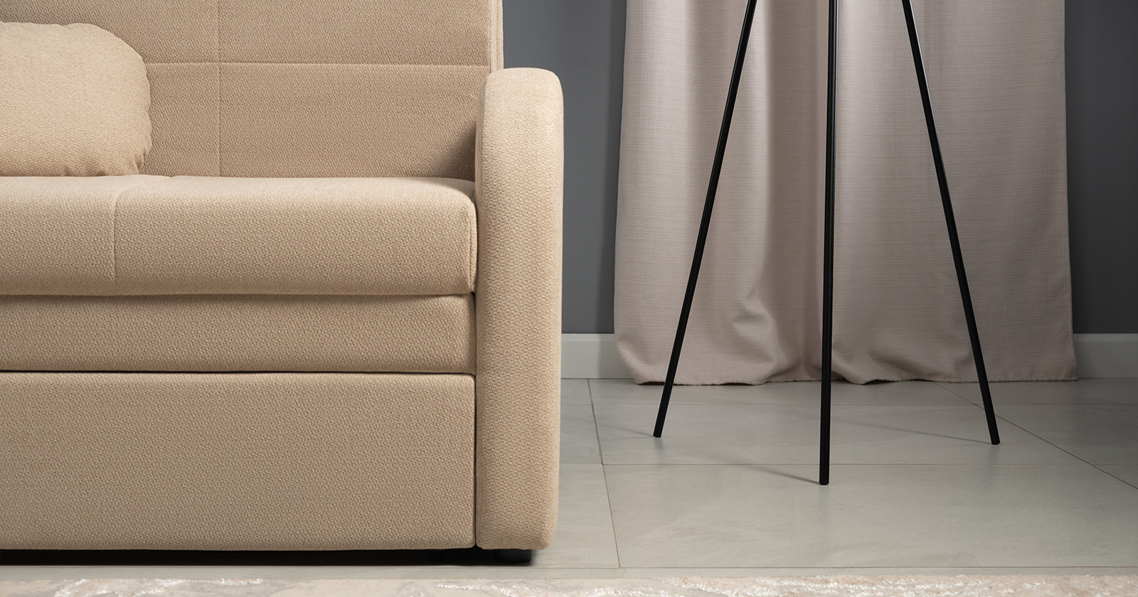 Коллекция выполнена в современном минималистичном стиле с мягкой обивкой из износостойкой ткани и декоративной стежкой, подчеркивающей геометрию форм. Механизм трансформации обеспечивает дополнительное спальное место, делая мебель не только эстетичной, но и максимально функциональной для небольших пространств.