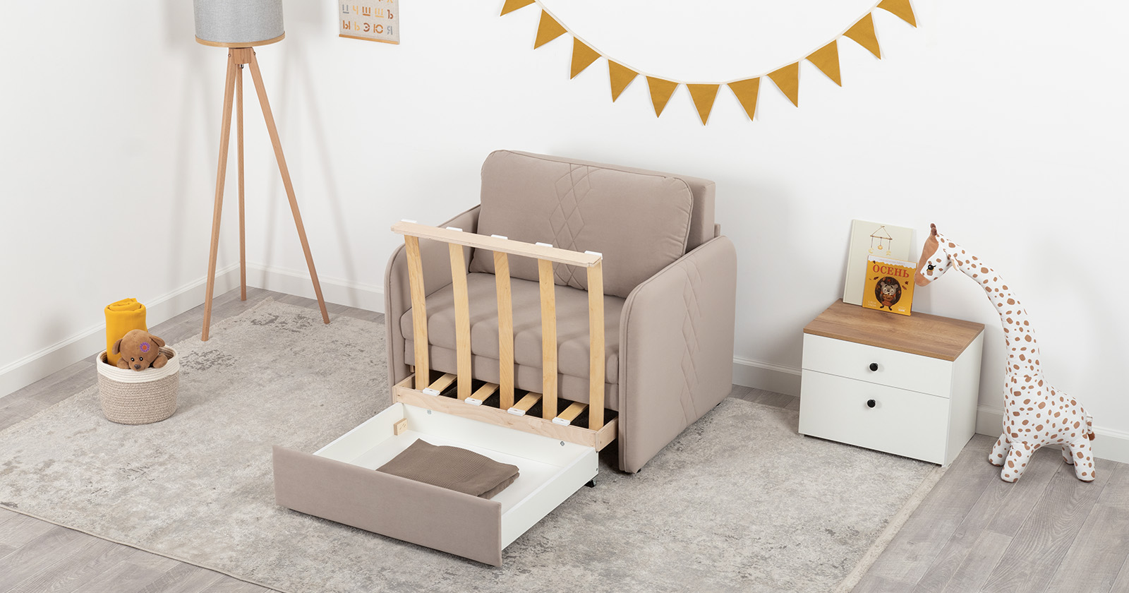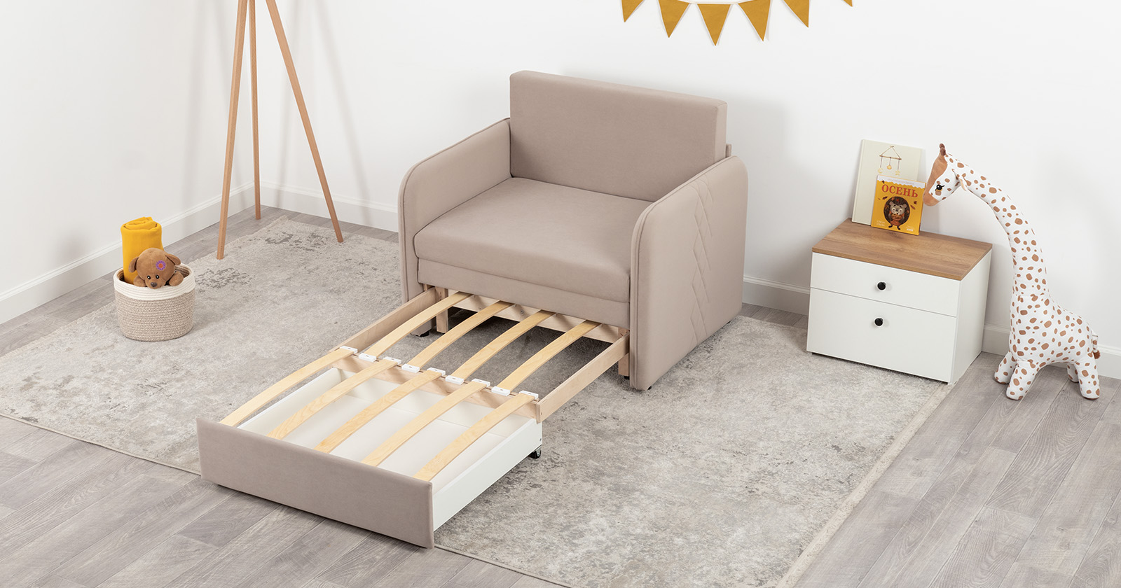 Стильный компактный диван для детской и гостиной. При своих скромных размерах он трансформируется в полноценное спальное место для детей и подростков. Лаконичный дизайн в виде декоративной стежки подчеркивает фактуру велюра, а небольшие размеры позволят разместить его в любом пространстве.