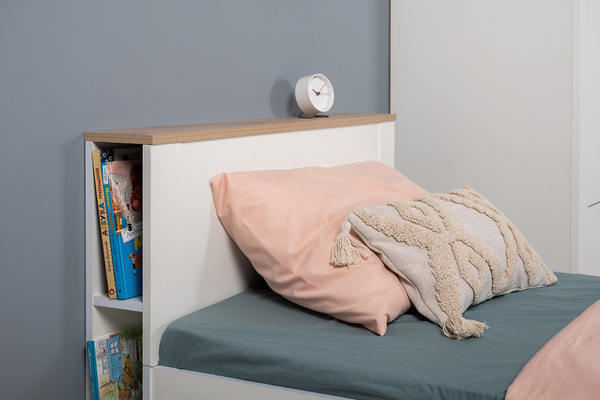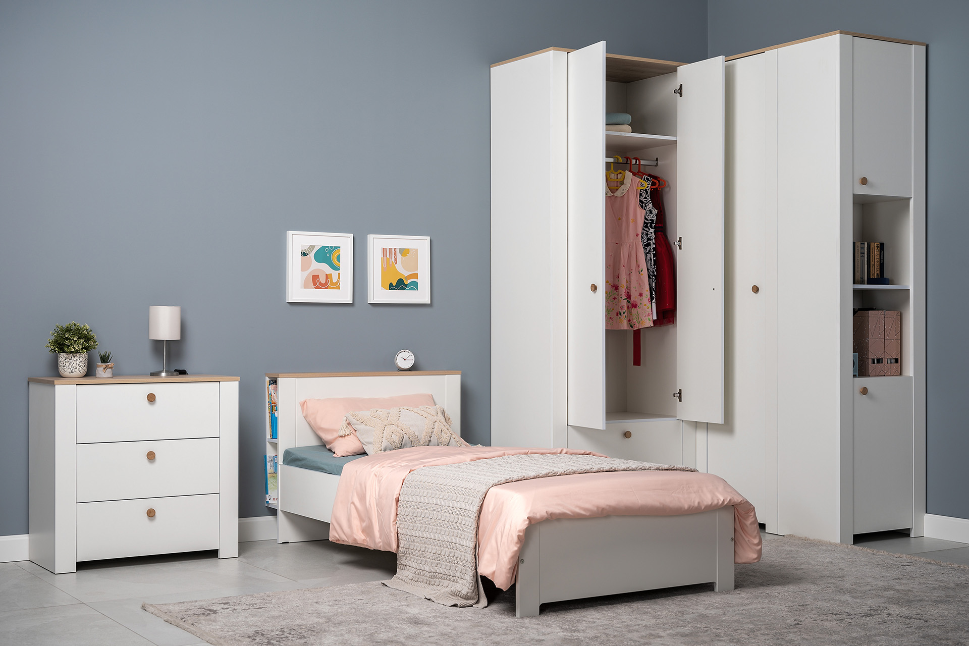 Джастин уникален тем, что подходит для разных возрастных категорий: для малышей – кроватка с защитным бортиком, съемными тканевыми кармашками и выкатными ящиками; для подростков – кровать с полноценным спальным местом и нишей для книг в изголовье; всевозможные модули для хранения. А в ящик письменного стола можно спрятать под замочек свои сокровища и секреты.