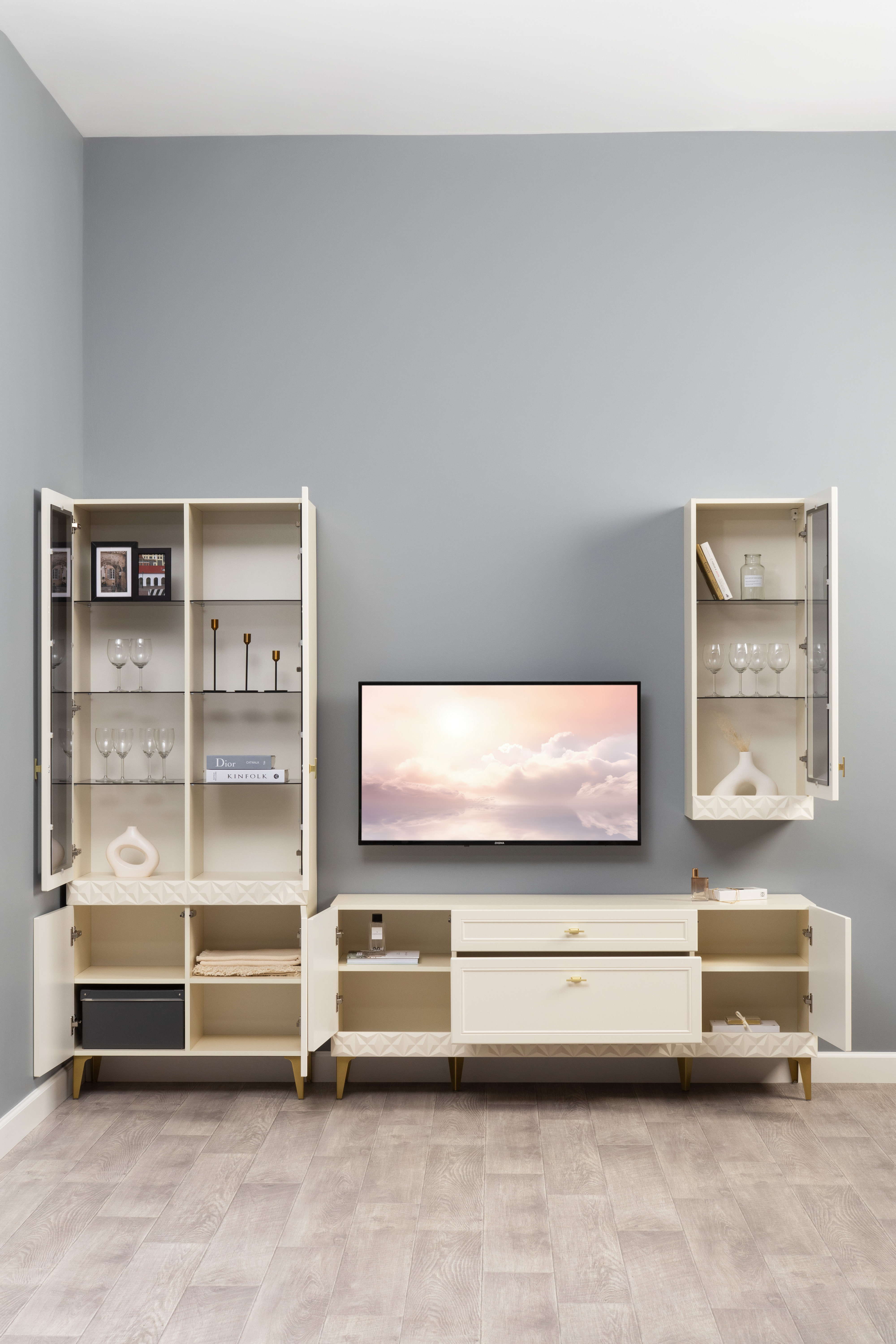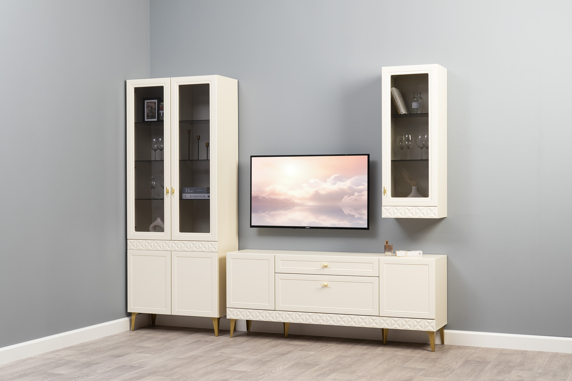 В коллекции представлены три типа витрин с тонированным закалённым стеклом, которые придают пространству лёгкость и свет. «Марион» — идеальное сочетание традиций и актуального дизайна в каждой детали.