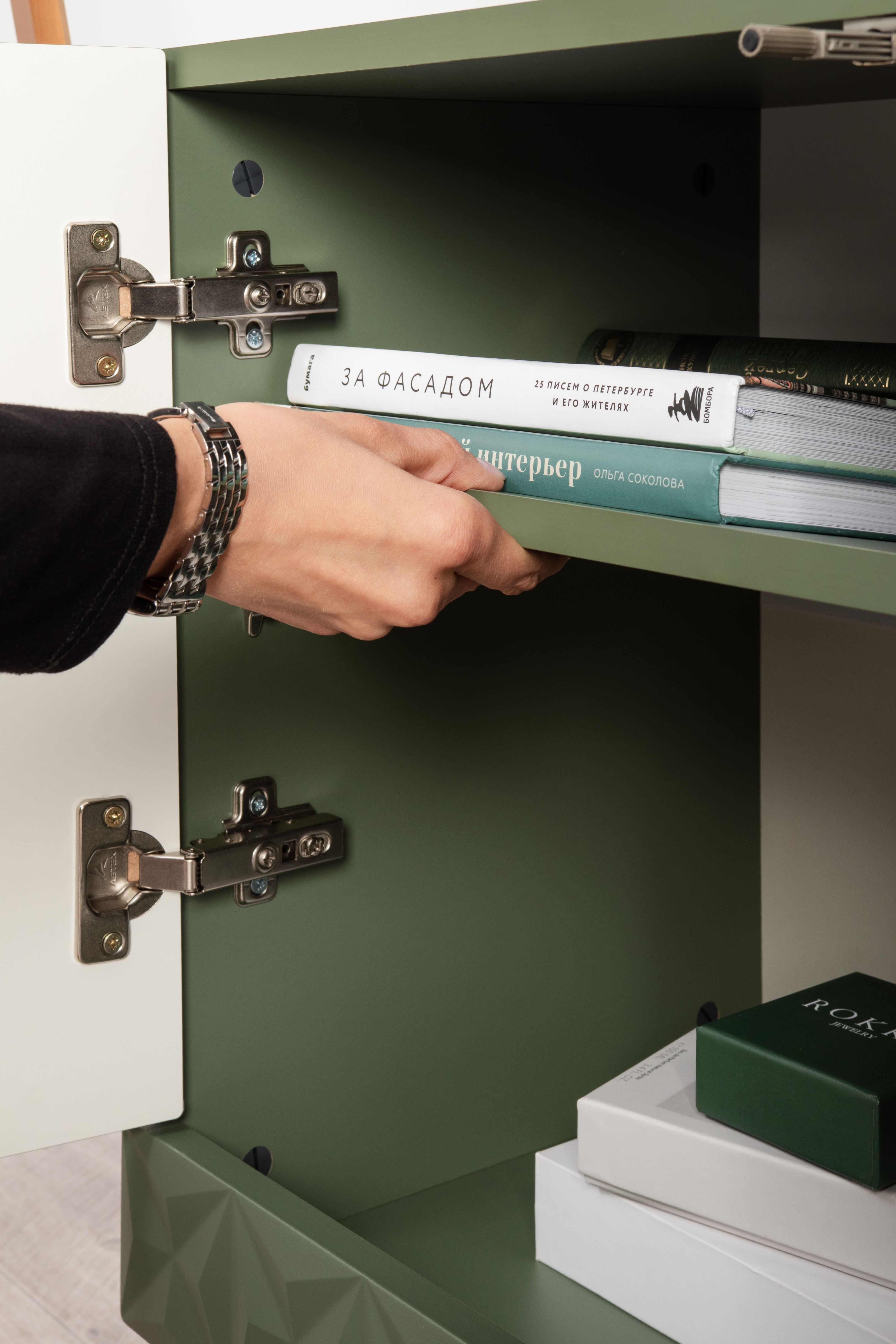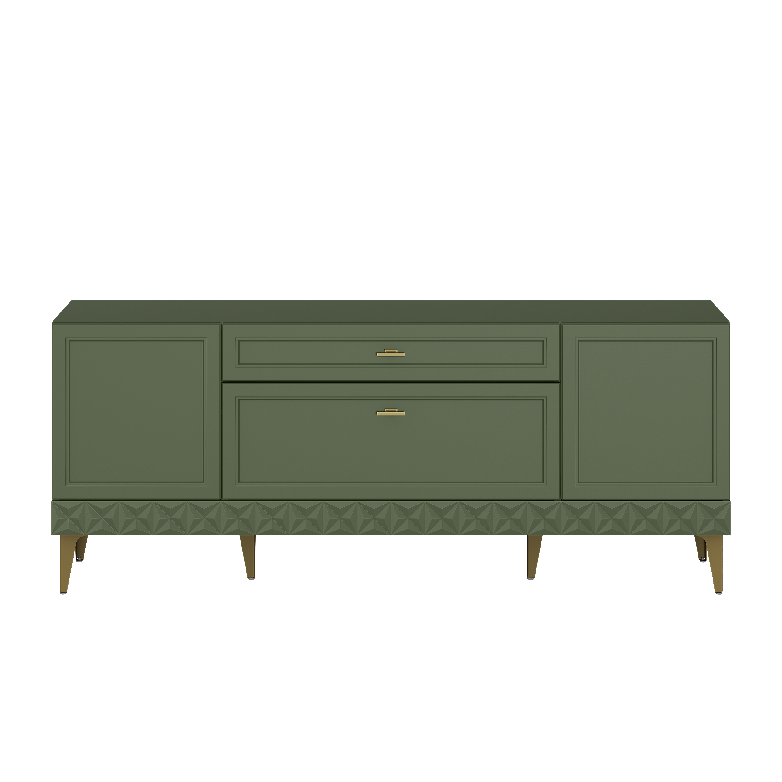 Изящные линии, глубокая фрезеровка фасадов из МДФ и благородные оттенки. Утончённая «Слоновая кость» и изысканная «Олива Шагрень» с глубоким зелёным тоном — создают атмосферу уюта, тепла и благородства. Металлические ручки и опоры золотого цвета придают мебели утончённый блеск, а петли и направляющие с доводчиками обеспечивают плавное и бесшумное закрытие фасадов.