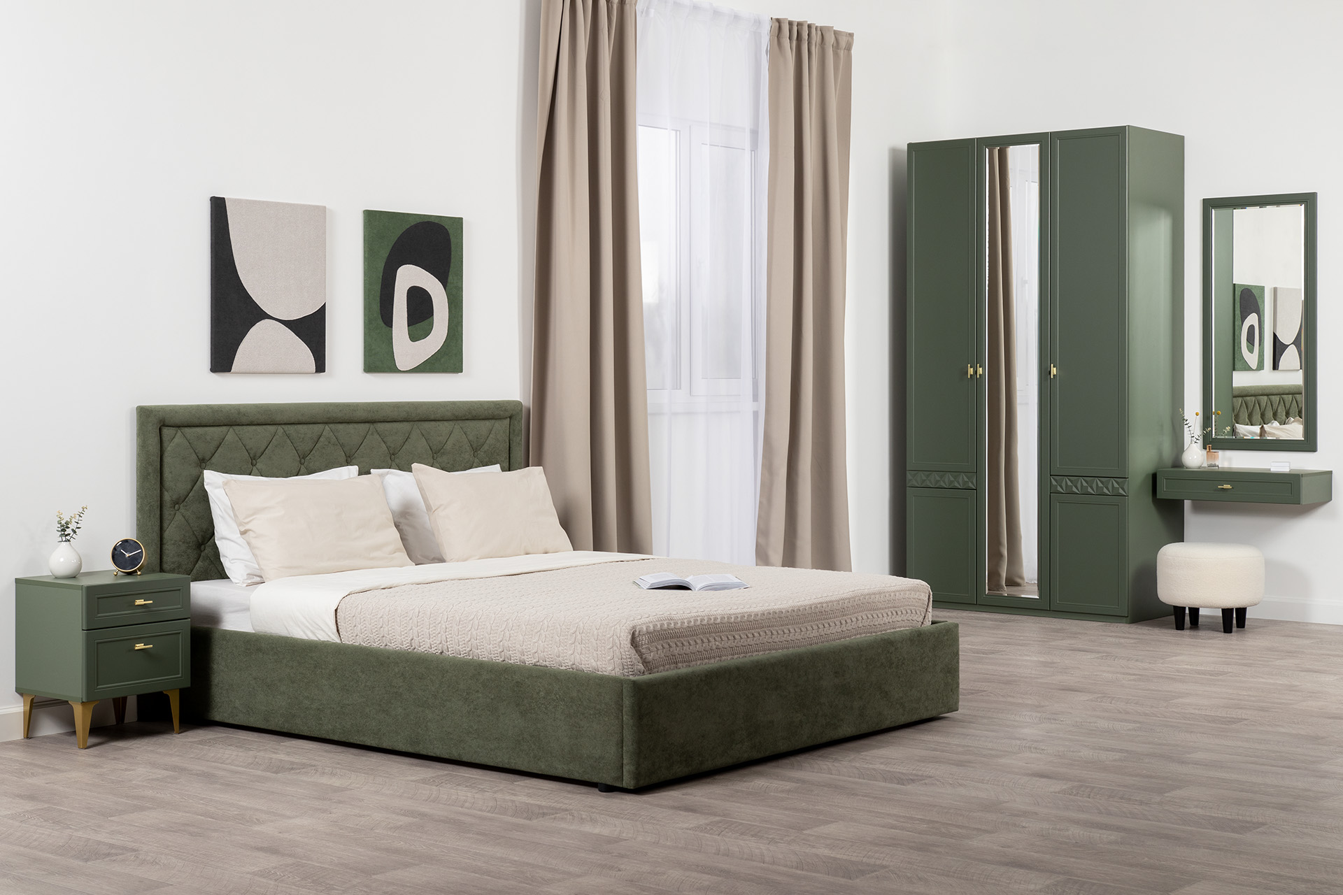 Изящные линии, глубокая фрезеровка фасадов из МДФ и благородные оттенки. Утончённая «Слоновая кость» и изысканная «Олива Шагрень» с глубоким зелёным тоном — создают атмосферу уюта, тепла и благородства. Металлические ручки и опоры золотого цвета придают мебели утончённый блеск, а петли и направляющие с доводчиками обеспечивают плавное и бесшумное закрытие фасадов.
